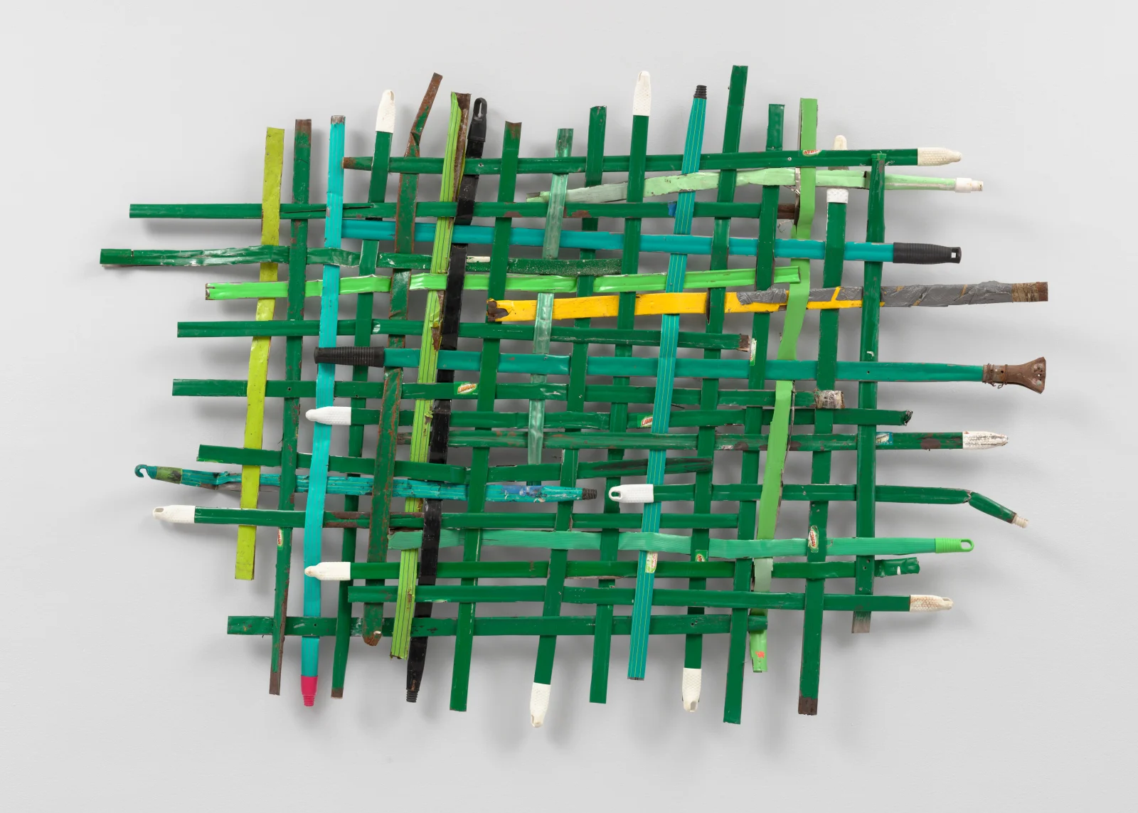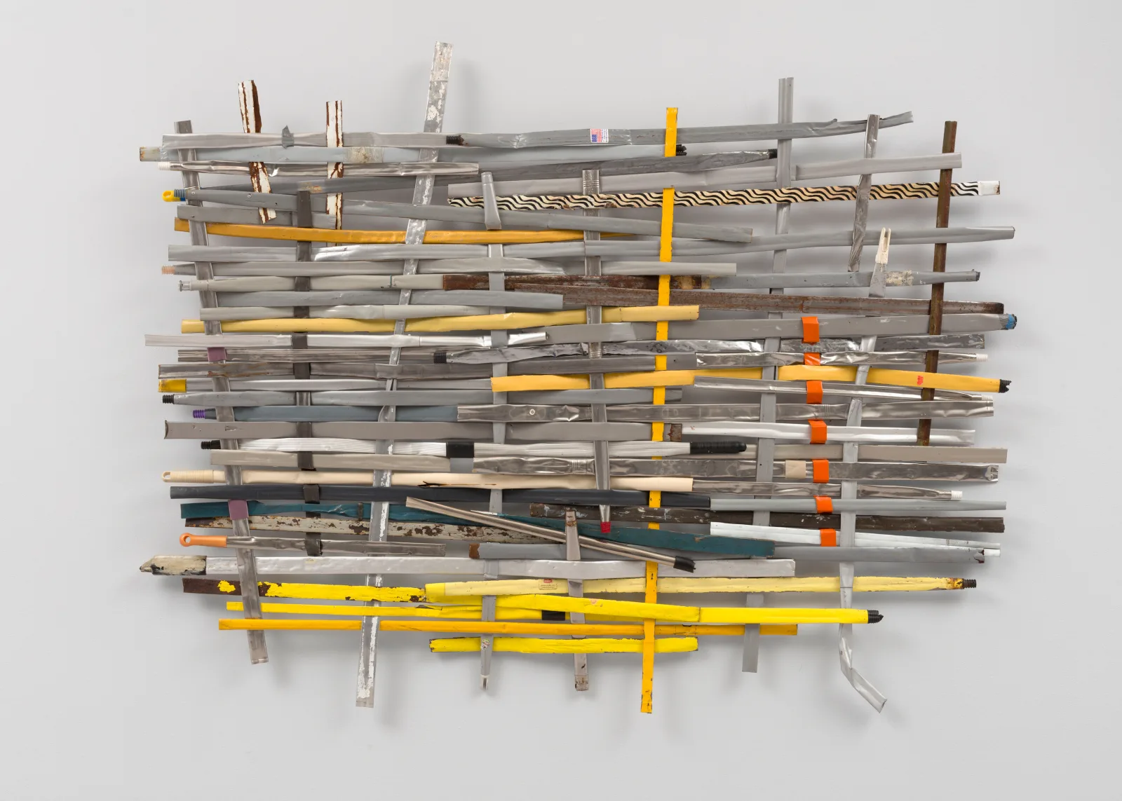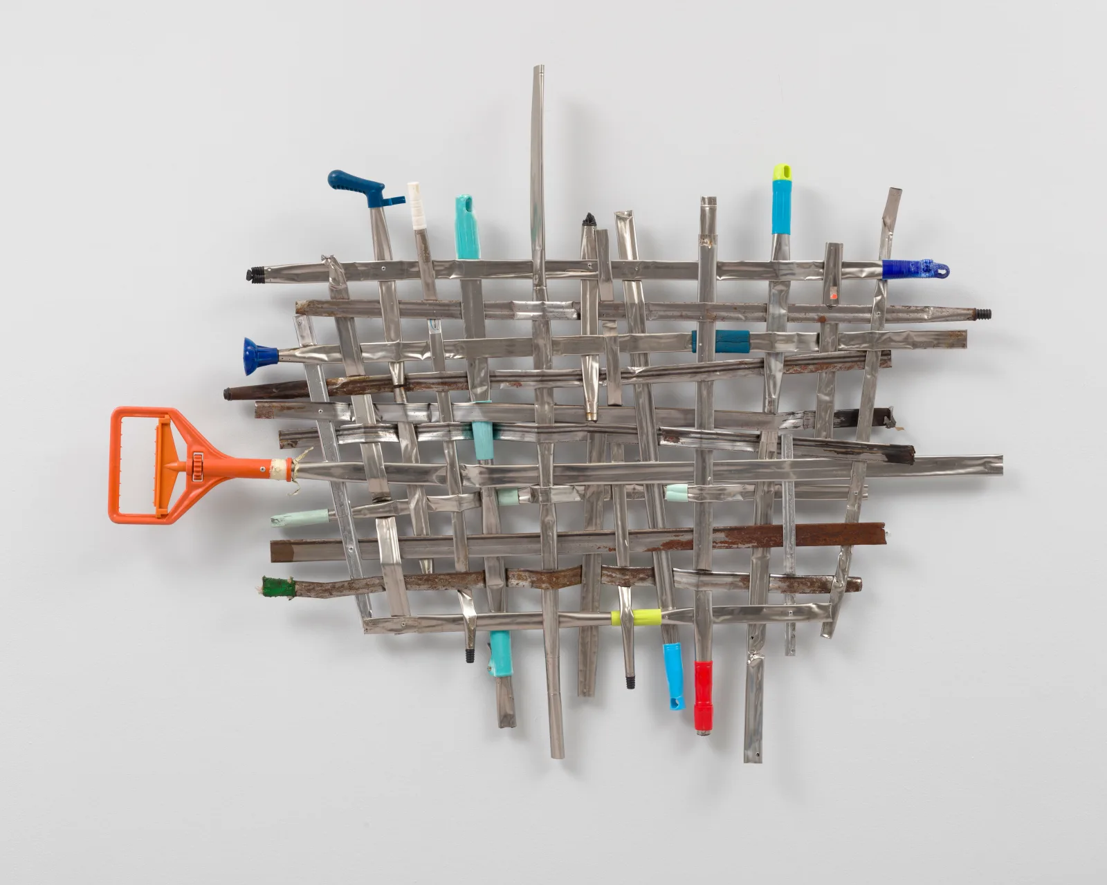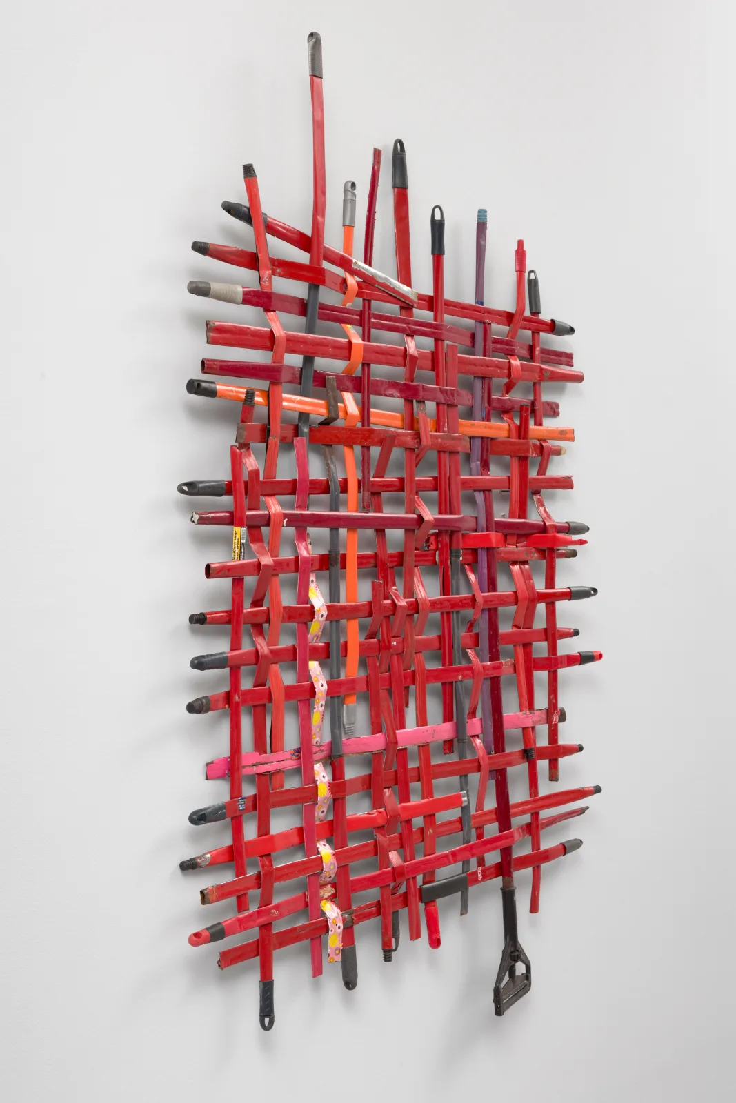 Untitled (Weaving), 2025. Brooms, mops, dust pans, extension poles, trash grabbers multi-purpose sticks, sticks unidentified. 76 ¼ x 51 x 3 ⅞ in