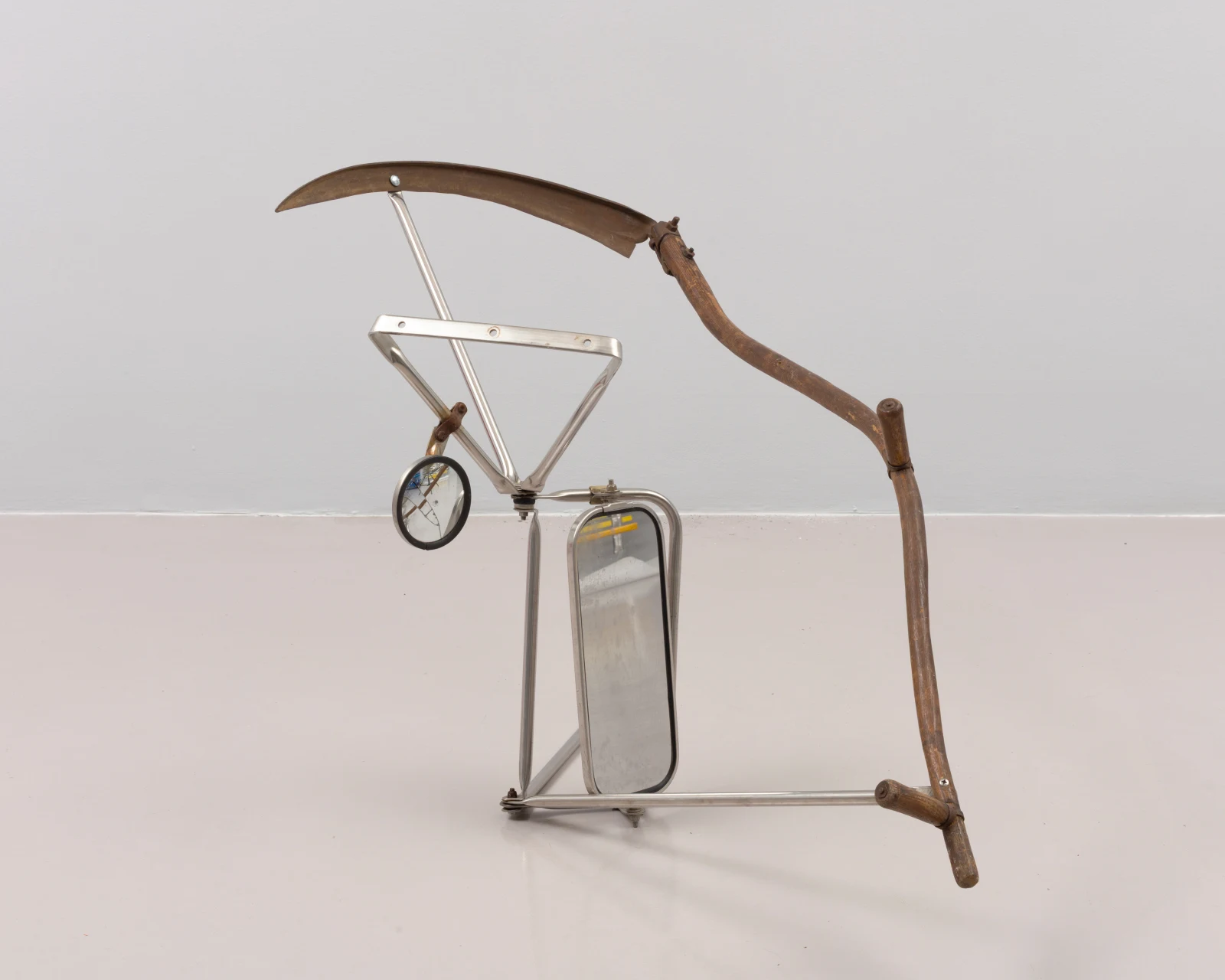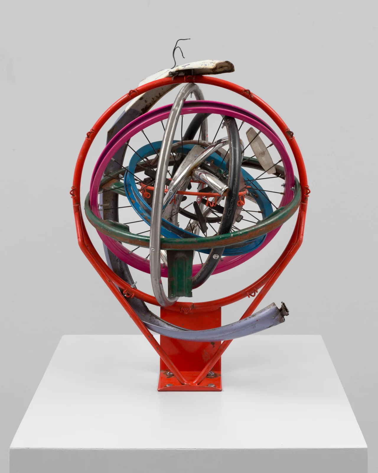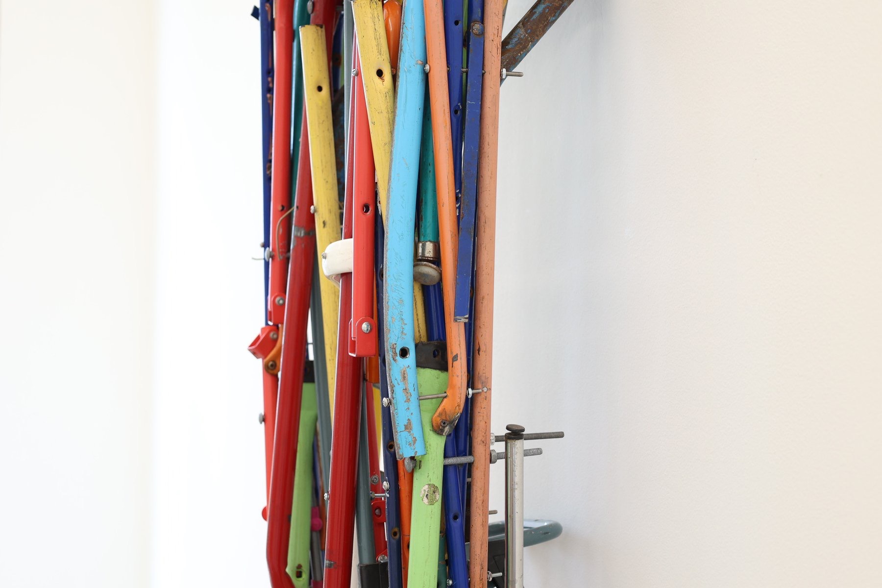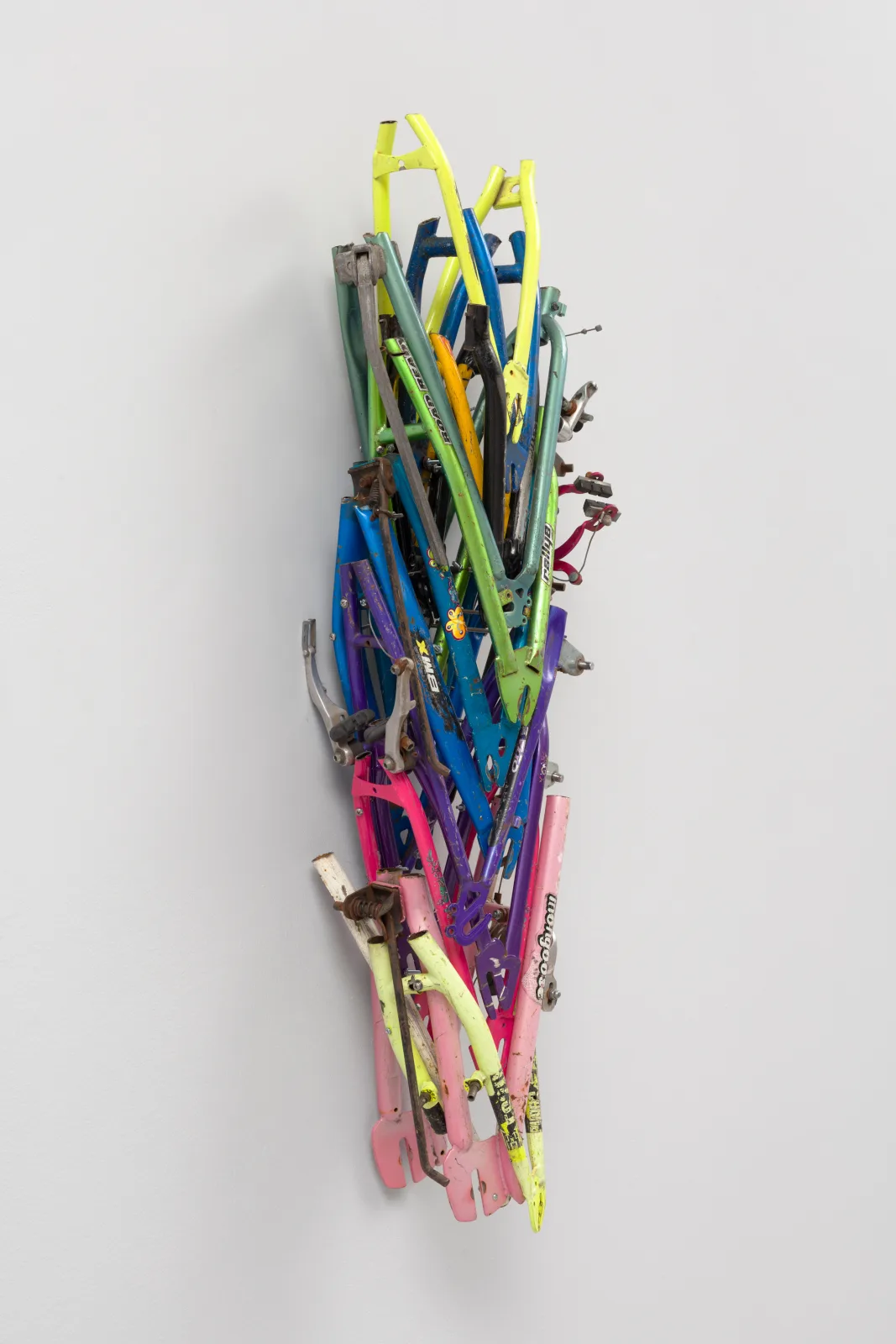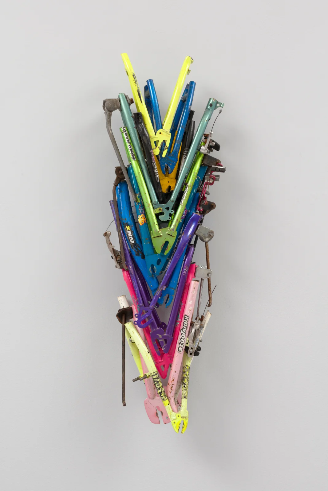 Untitled (V), 2025. Bike parts and steel hardware. 42 ⅜ x 15 x 7 ¾ in