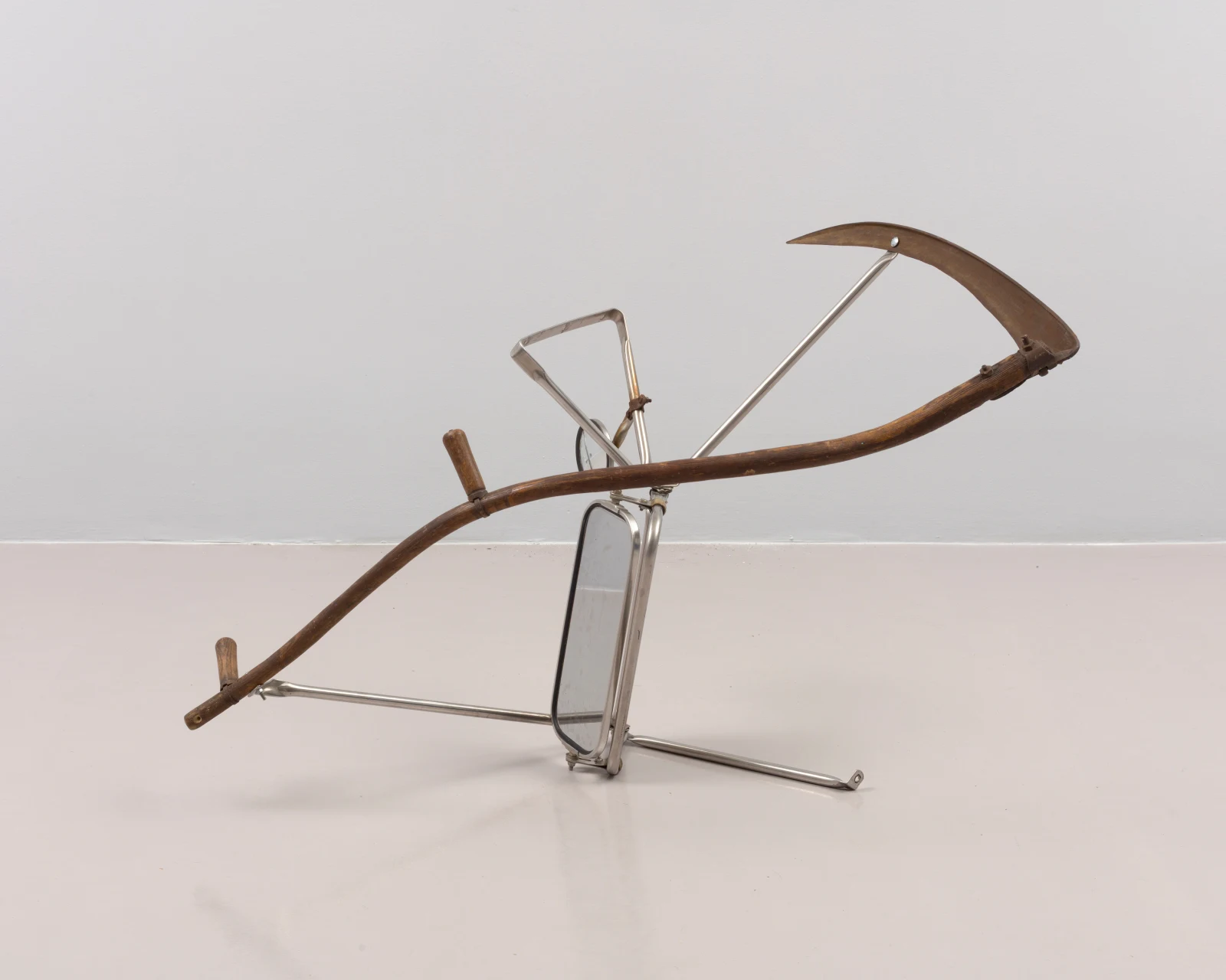 Dancers, 2021. scythe, trucking door mount mirror, steel hardware. 35 x 54 x 33 in