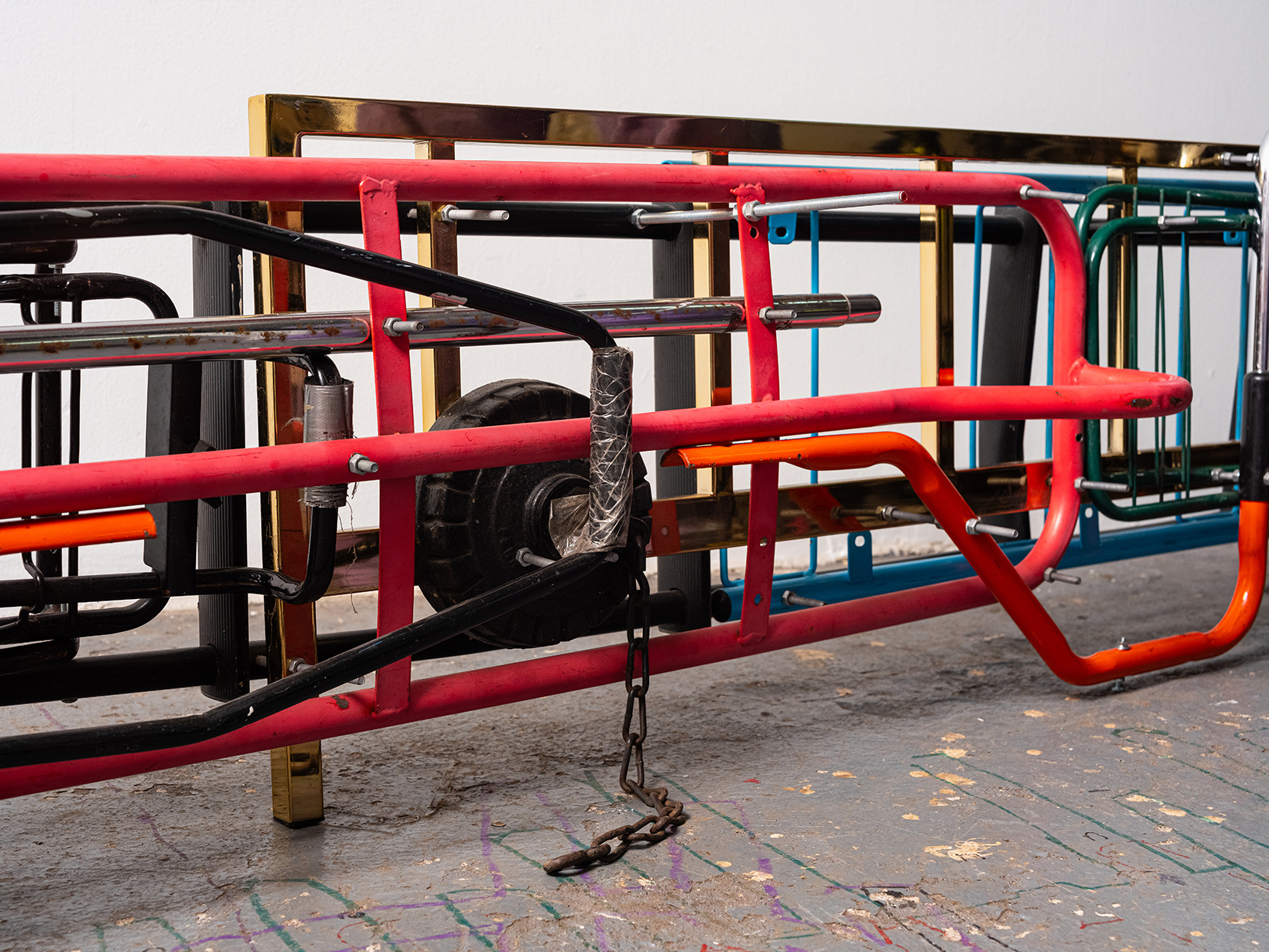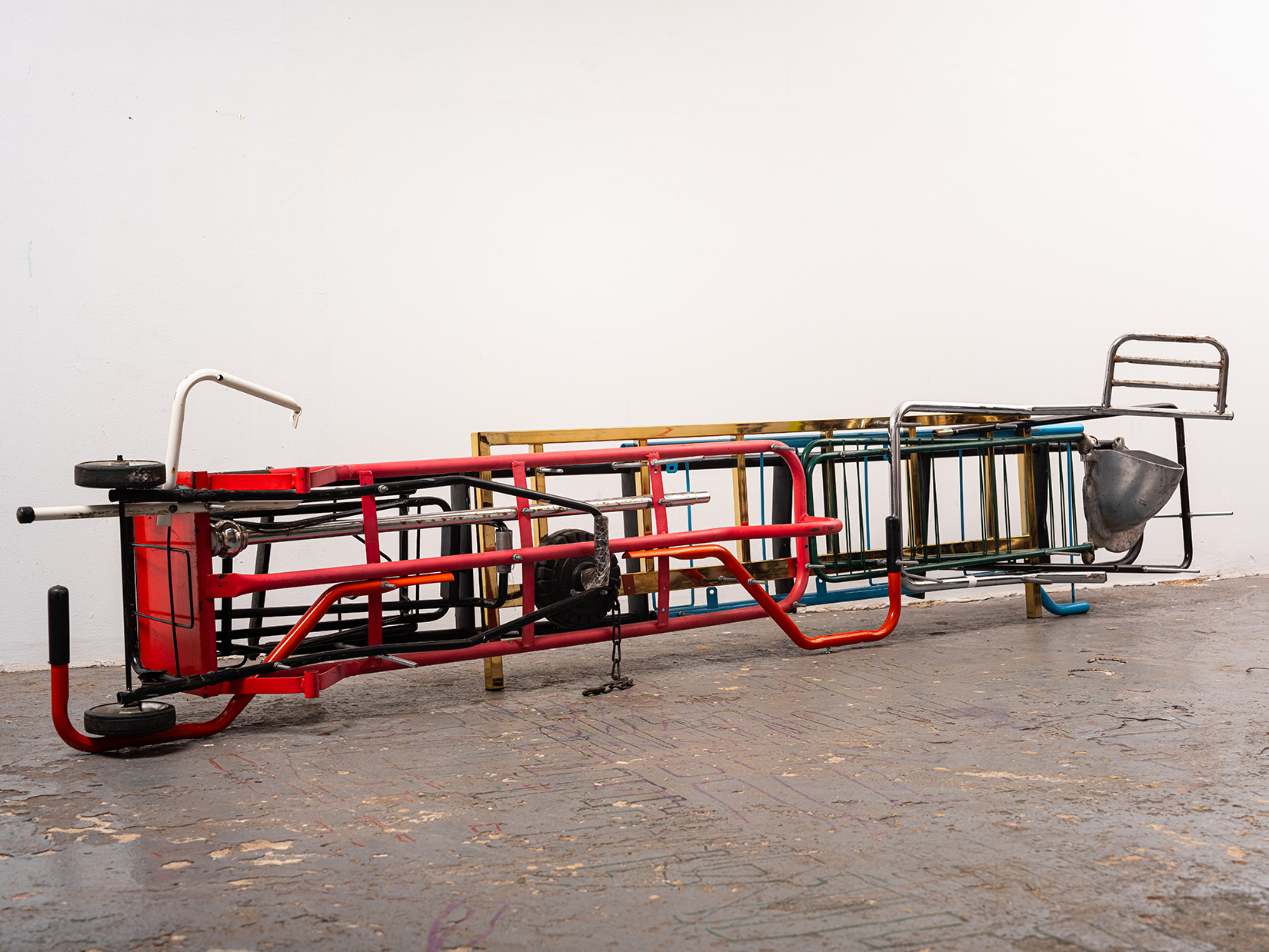 Untitled (Compression), 2024. Hand cart, push carts, Chevrolet Astro side ladder, bed frame components (adult and child size), office chair component, motorcycle accessory, mini rubberized shelving unit, sidewalk salt spreader handles, half of curtain hanging rod, step stool rails support, fire hydrant cap with chain, feed hopper for electric grater, carriage nut and bolts, zinc-plated threatening rods, lock washers, nuts and bolts. 25 x 110 x 19 in
