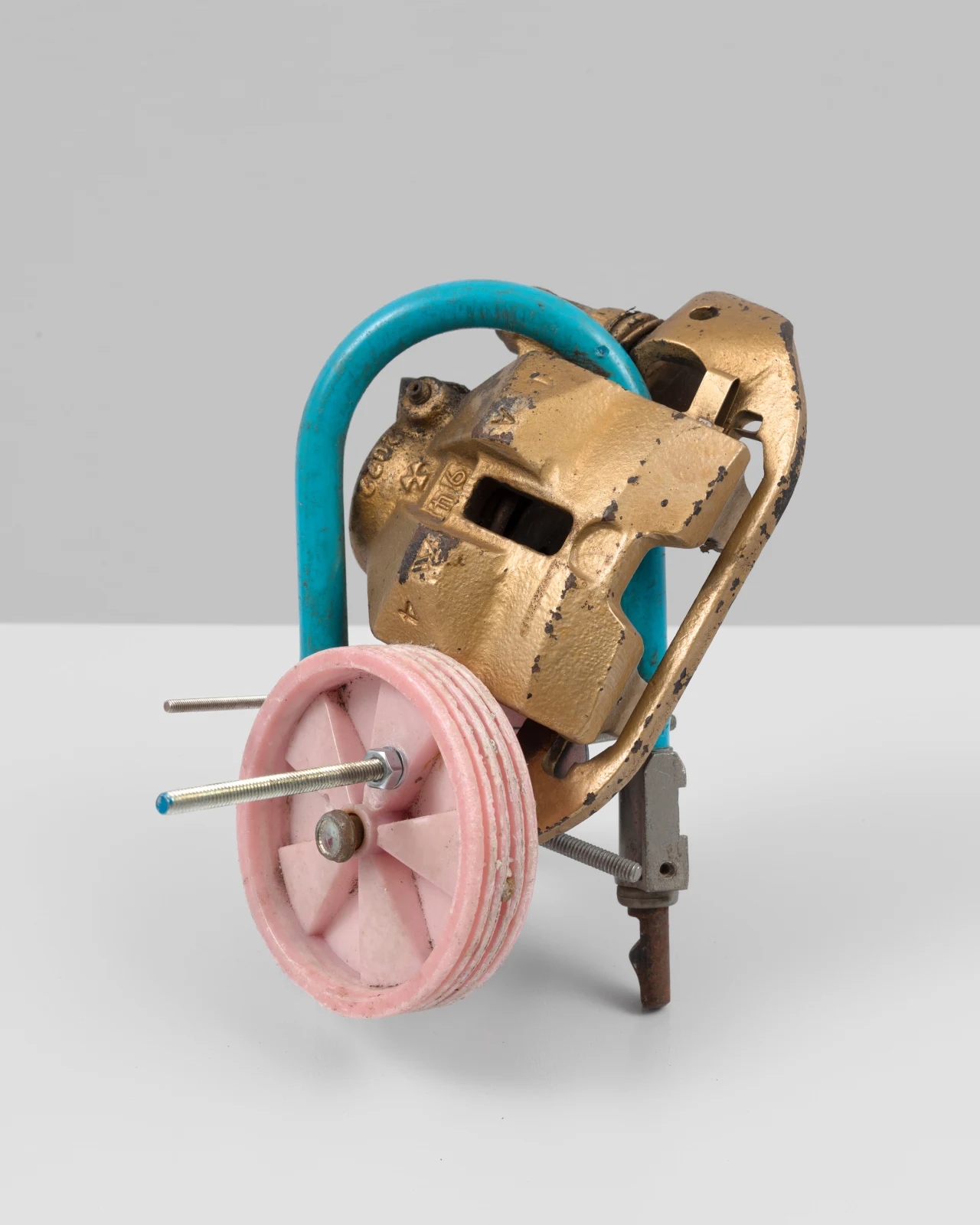 Untitled (wheel), 2025. Training wheel, bike lock, motorcycle component hand truck and steel hardware. 8 ¾ x 8 ⅛ x 9 ½ in